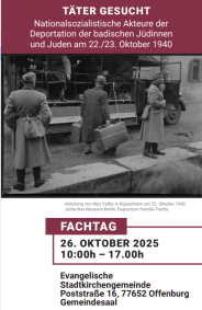 Der Förderverein Ehemalige Synagoge Kippenheim e.V. veranstaltet in Kooperation mit der Landeszentrale für politische Bildung den Fachtag „Nationalsozialistische Akteure der Deportation der badischen Jüdinnen und Juden am 22./23. Oktober 1940“. Mehrere Referentinnen nehmen die lokalen Akteure der Deportation in den Fokus und berichten über aktuelle Forschungsergebnisse.